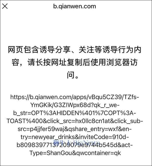 刚刚,有记者发现,千问的红包分享链接也被微信屏蔽,页面显示网页存在诱导或误导下载/跳转的内容,需要跳转第三方浏览器访问。同时,部分用户在千问APP点击分享活动至微信好友时,已自动改为复制口令形式。