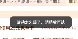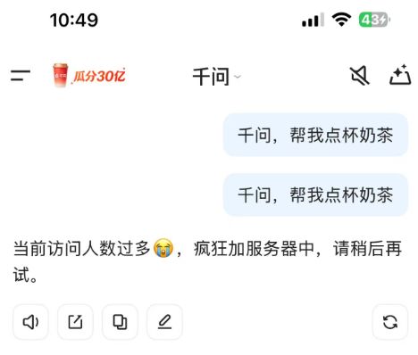 千问0.01元点奶茶活动页面显示:“活动太火爆了,请稍后再试”。
