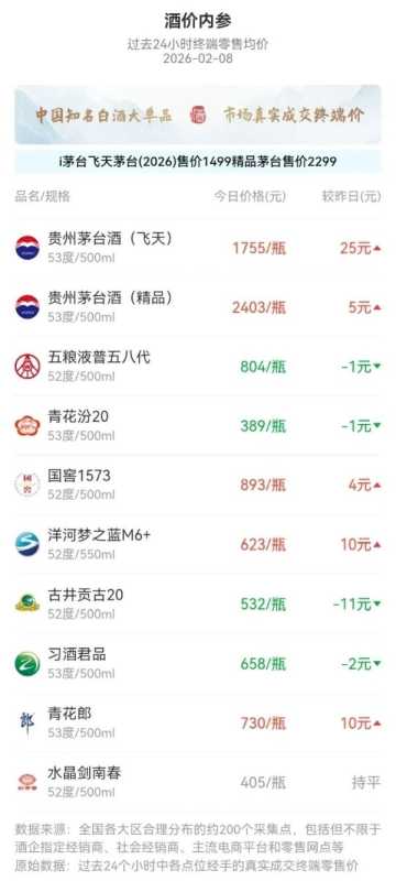 2月8日,贵州茅台飞天酒大幅上涨25元/瓶,实现价格四连涨,延续春节前需求支撑的强势表现;洋河梦之蓝M6+和青花郎均上涨10元/瓶;精品茅台上涨5元/瓶,突破2400元关口;国窖1573小幅上涨4元/瓶。古井贡古20下调11元/瓶;习酒君品回落2元/瓶;五粮液普五八代与青花汾20均小幅下调1元/瓶;水晶剑南春价格保持稳定,与前一日持平。