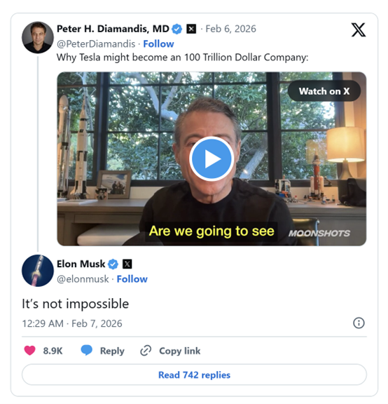 随着特斯拉业务版图超越汽车与能源领域,涉足人工智能和机器人领域,投资者对其抱有高期望。有投资者预测特斯拉市值有望达到100万亿美元。特斯拉首席执行官埃隆·马斯克表示这并非不可能实现。