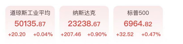 *三大股指收涨,道指连续第二天站上50000点;