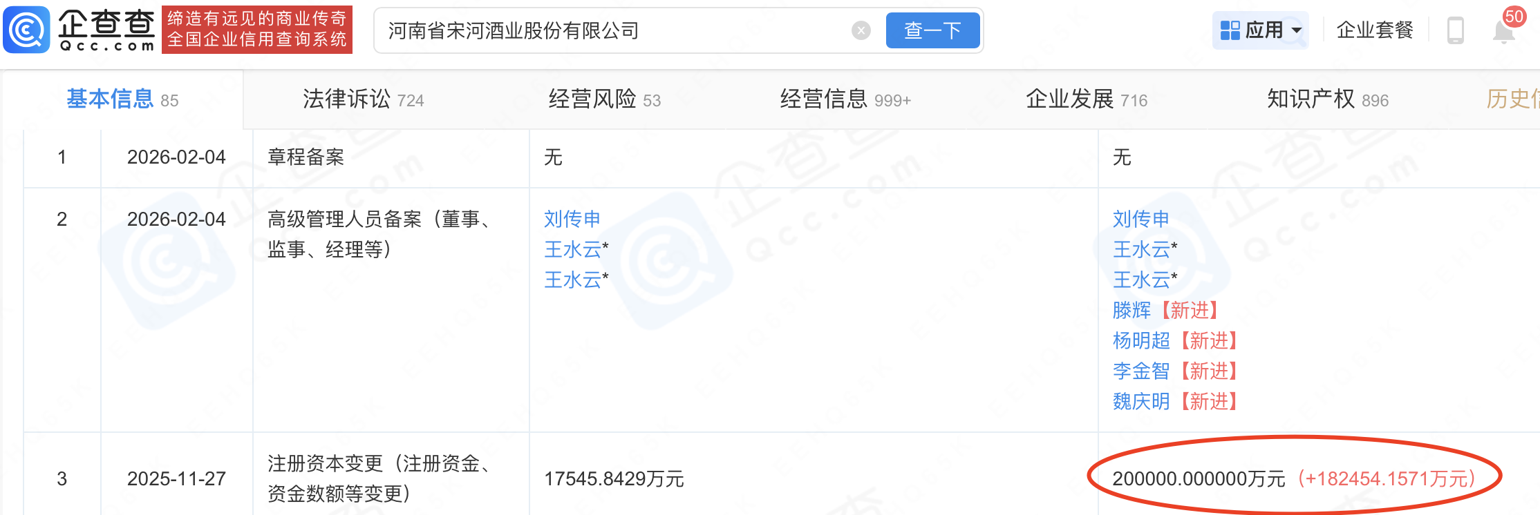 同月11月,宋河酒业注册资本由1.75亿元增至20亿元,锅圈实业以51.81%的持股份额成为宋河酒业控股股东,后者实际控制人变更完杨明超。如今,随着杨明超正式走上前台就任董事长一则,宋河酒业也将进入“杨明超时代”。