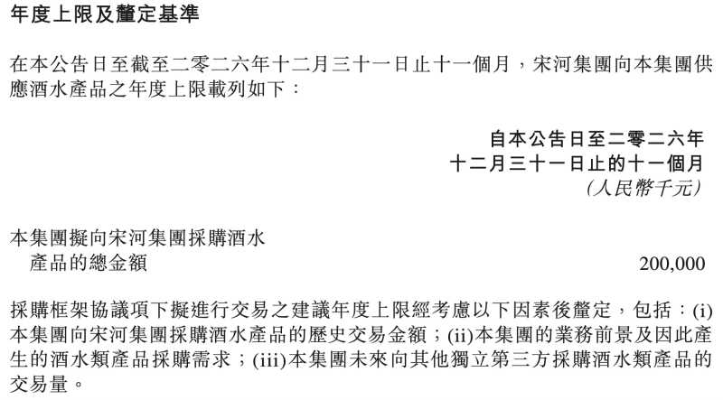 2月4日,锅圈发布公告称,董事会已同意公司与宋河订立采购框架协议,集团向宋河采购酒水产品用于日常使用及向客户销售。自公告日至2026年12月31日止的十一个月,集团拟向宋河采购酒水产品的总金额上限为2亿元。这就意味着,锅圈将在门店体系内采购并售卖宋河酒业相关产品。