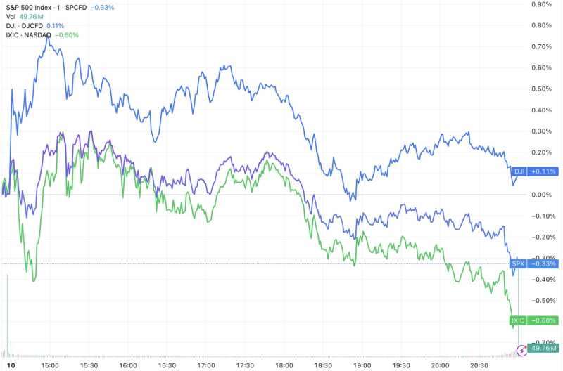 截至收盘,道琼斯指数涨0.10%,报50,188.14点;标普500指数跌0.33%,报6,941.81点;纳斯达克指数跌0.59%,报23,102.47点。