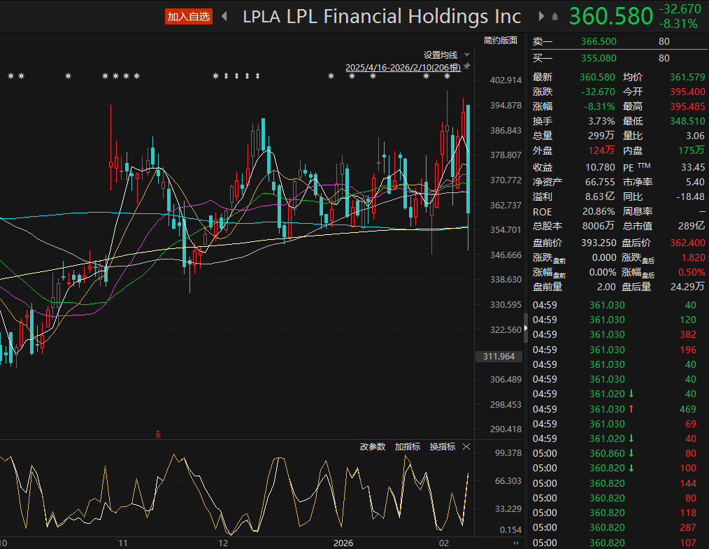 美国最大的独立财务顾问服务平台之一LPL Financial 2月10日股价大跌8.31%,该公司的核心业务是为独立财务顾问及金融机构提供全面的后台平台支持。