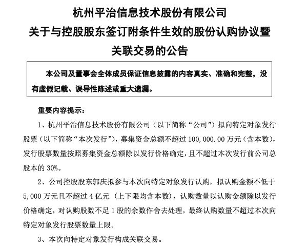平治信息(300571)公告拟向特定对象发行股票募集资金总额不超过10亿元用于国产智能算力中心建设项目和补充流动资金。
