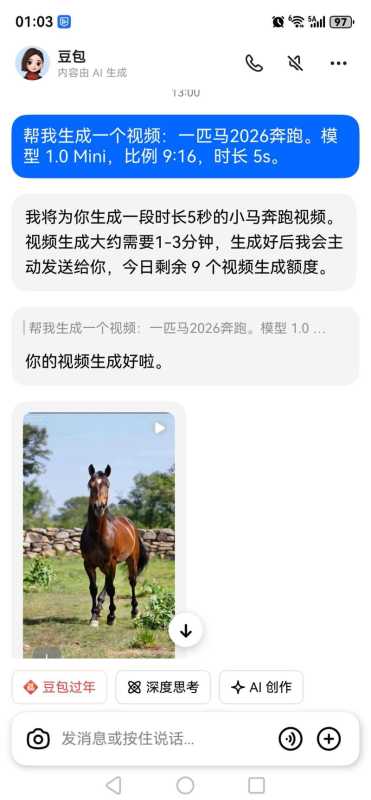 随后,记者在豆包App中点击“AI创作”,尝试生成“2026年一匹奔跑的马”。约2分钟过后,一条5秒钟的视频生成,效果逼真。同时,豆包提示记者:“今日剩余9个视频生成额度”。