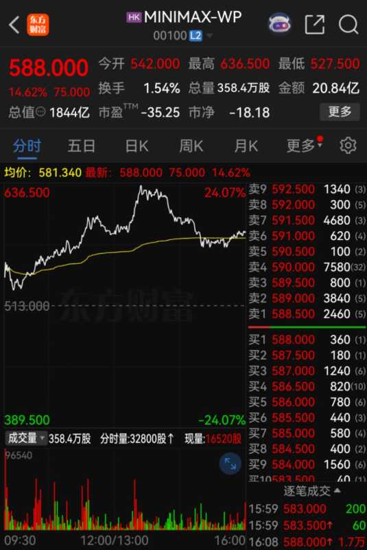 2月12日盘中,MiniMax、智谱均大涨,其中,MiniMax的市值一度逼近2000亿港元。2月12日收盘,MiniMax股价报588港元/股,涨幅达14.62%,总市值为1844亿港元。