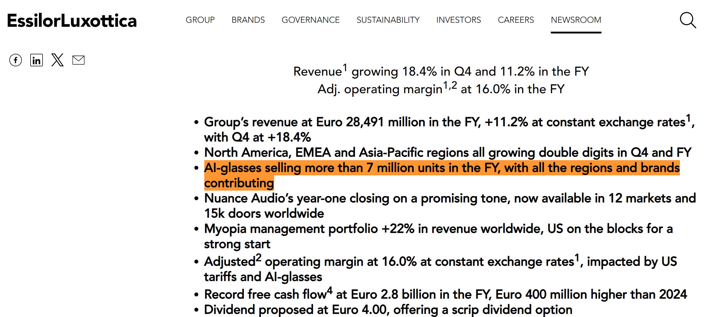依视路陆逊梯财报显示,其AI眼镜在2025年的出货量超过700万副,相当于2023年和2024年合计销售约200万副的3倍有余。