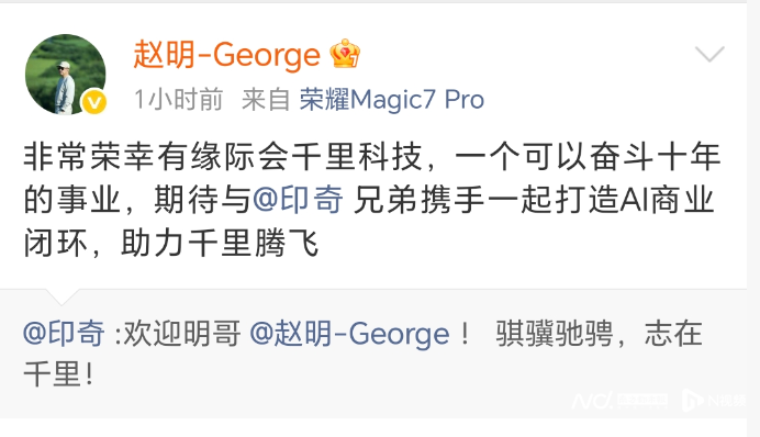 2月12日,荣耀前CEO赵明在社交媒体平台宣布正式加入千里科技。今日晚间,千里科技发布公告称,增设联席董事长一名,并提名赵明为公司第六届董事会非独立董事候选人。