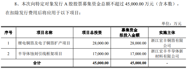 2月12日晚,温州宏丰(300283)公告,公司拟向特定对象发行A股股票,募集资金总额不超过4.5亿元,扣除发行费用后,拟投入锂电铜箔及电子铜箔扩产项目和半导体蚀刻引线框架项目。