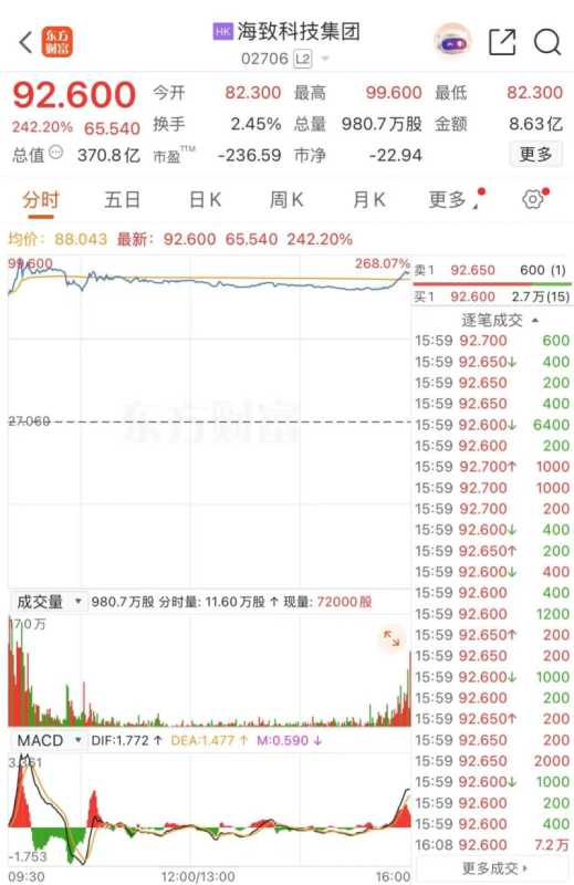 上市首日,海致科技集团盘中最高触及99.6港元/股,较发行价上涨268.07%。截至当日收盘,海致科技集团报92.6港元/股,涨242.2%,总市值约370.8亿港元,成为年内首日涨幅最高的港股新股。