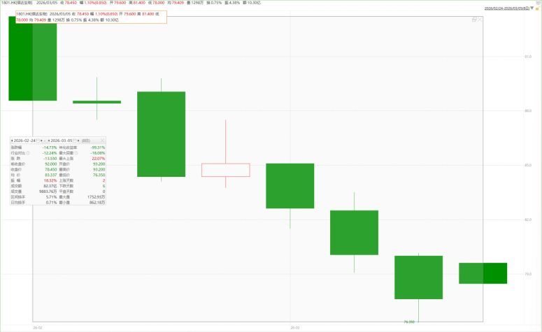 公司发布业绩利好公告后,二级市场反应冷淡,甚至出现多日连跌。Wind数据显示,2026年2月24日—3月5日,信达生物累计跌幅14.73%,超过同行业12.24%的跌幅。