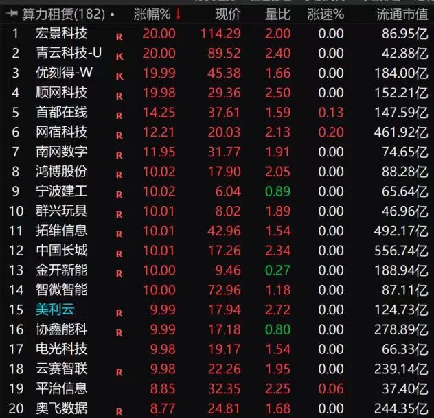 虽然,全球股市大跌,但小龙虾(OpenClaw)还是在二级市场彻底引爆。其中,优刻得大幅高开之后,迅速涨停。算力租赁板块整体大爆发,截至收盘,该板块掀起涨停潮,18只股票涨停。