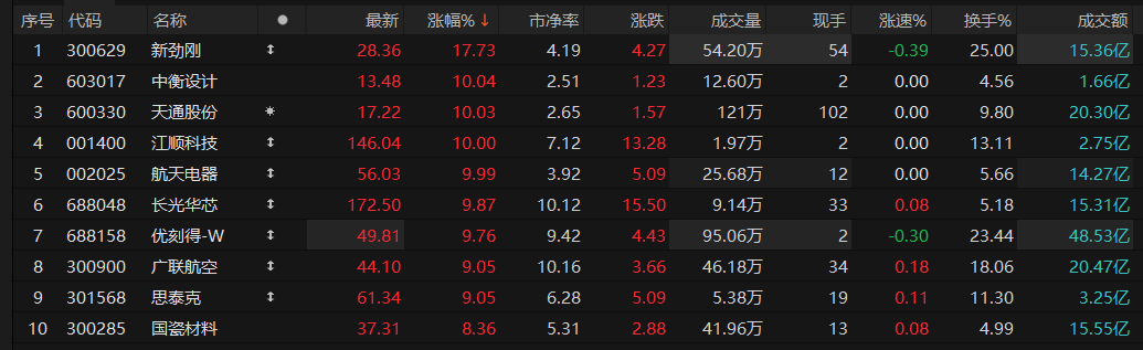 商业航天概念走强,新劲刚、优得刻-W涨超10%,中衡设计、天通股份、航天电器涨停。