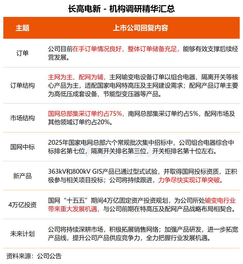 长高电新表示,国家电网“十五五”期间4万亿固定资产投资规划,为公司所处的输变电行业带来重大发展机遇,与公司前期在特高压及配网产品的战略布局相契合。