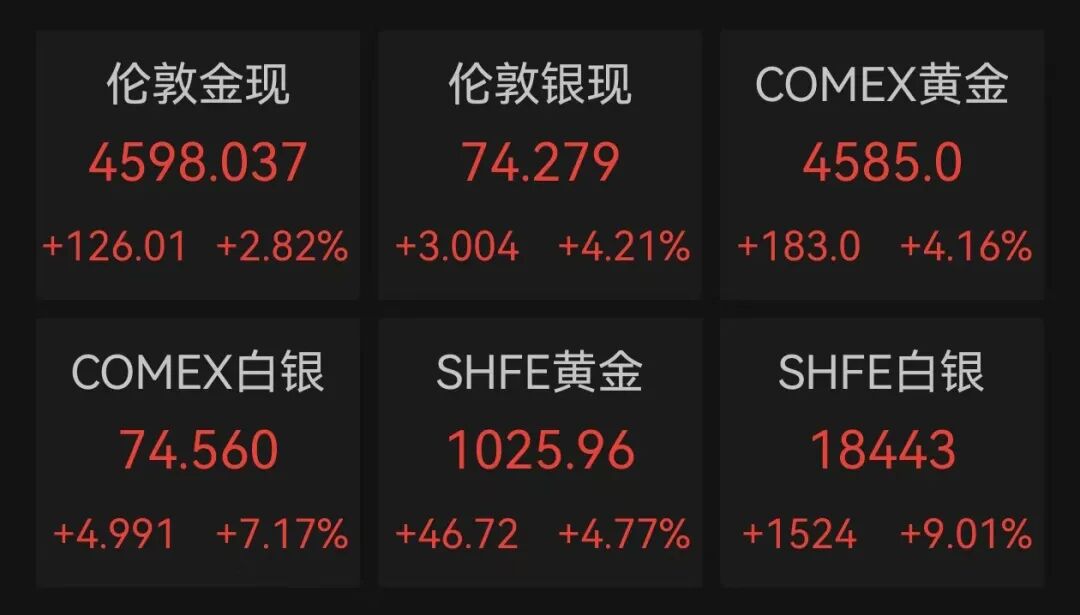 国际贵金属市场大幅上涨。Wind数据显示,截至北京时间3月25日9:50,伦敦金现上涨2.82%,报4598.037美元/盎司;COMEX黄金期货上涨4.16%,报4585美元/盎司;伦敦银现上涨4.21%,报74.279美元/盎司;COMEX白银期货上涨7.17%,报74.56美元/盎司。