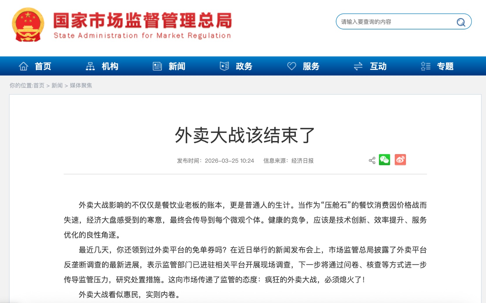 消息面上,国家市场监督管理总局官网转发经济日报评论文章《外卖大战该结束了》。文章称“在近日举行的新闻发布会上,市场监管总局披露了外卖平台反垄断调查的最新进展,表示监管部门已进驻相关平台开展现场调查,下一步将通过问卷、核查等方式进一步传导监管压力,研究处置措施。这向市场传递了监管的态度:疯狂的外卖大战,必须熄火了。”