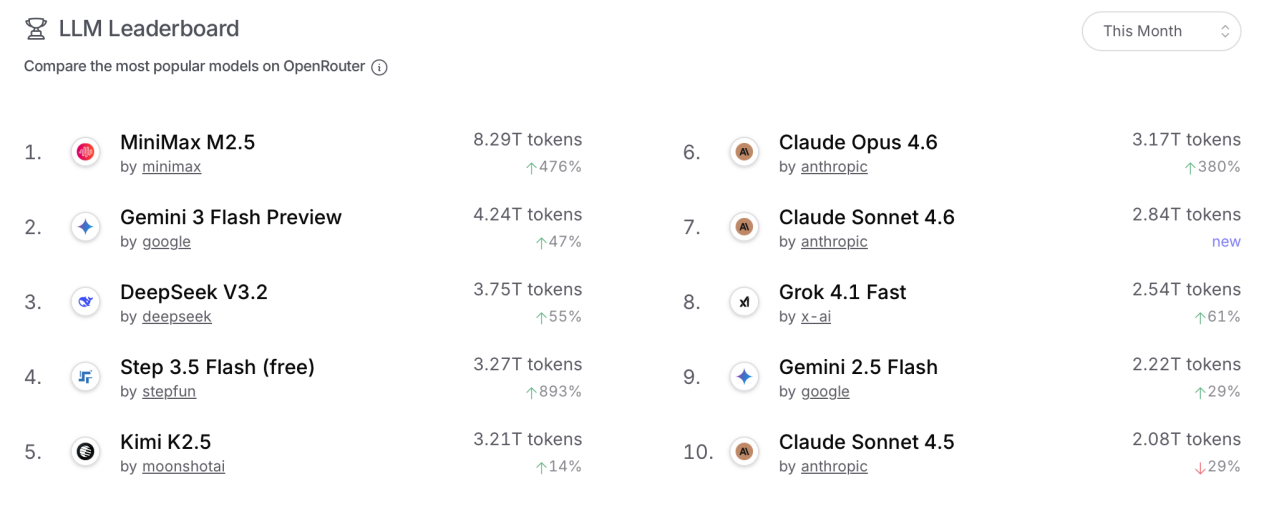 看结果:本月Token榜单中,MiniMax M2.5排名第一,DeepSeek V3.2、Step 3.5 Flash、Kimi K2.5均进入前五,中国大模型在前五中占据四席,连续四周在Token侧保持强势增长态势。