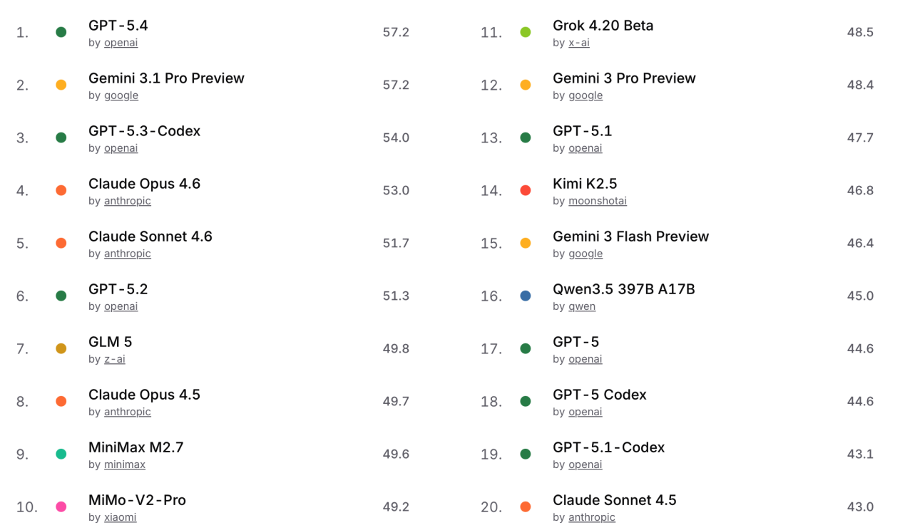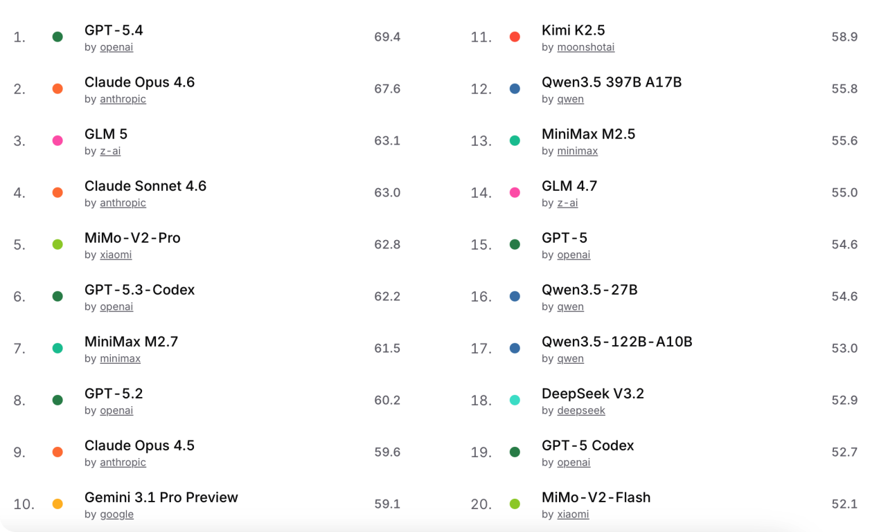 综合能力榜中,GPT-5.4与Gemini 3.1 Pro Preview并列第1;中国模型中,GLM 5第7,MiniMax M2.7第9,MiMo-V2-Pro第10。