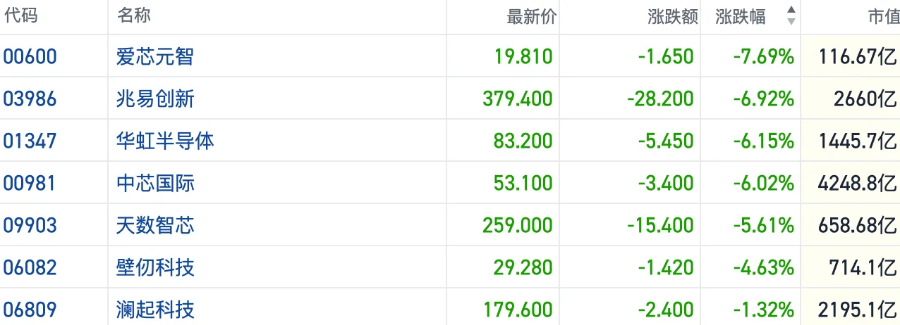 截至发稿,爱芯元智(00600.HK)、兆易创新(03986.HK)均跌约7%,中芯国际(00981.HK)等晶圆代工和算力芯片厂商跟跌。