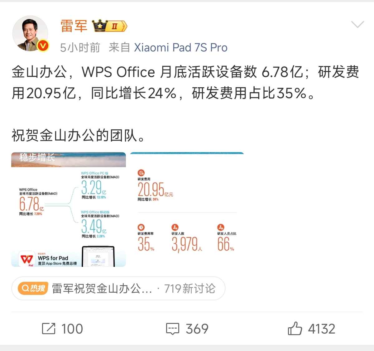 上证报中国证券网讯(记者窦世平)“金山办公,WPS Office月底活跃设备数6.78亿;研发费用20.95亿元,同比增长24%,研发费用占比35%。祝贺金山办公的团队。”小米集团董事长、金山办公名誉董事长雷军3月26日在微博和小红书发文祝贺金山办公团队。金山办公官方随即回应,承诺将拿出更多“不可思议”的AI办公产品服务好全球用户。