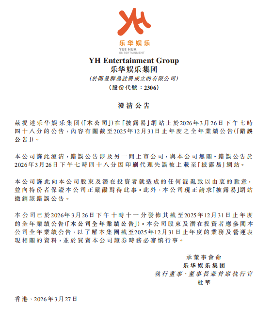 3月26日下午10时11分,乐华娱乐重新发布了其截至2025年12月31日的全年业绩公告。