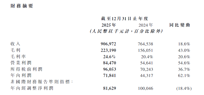 根据乐华娱乐重新披露的公告,2025年,乐华娱乐收入为9.07亿元(人民币,下同),较2024年的7.65亿元增长18.6%;毛利为2.23亿元,同比增加43.0%,毛利率由20.4%上升至24.6%。