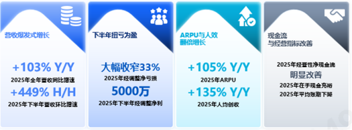 经营质量方面,公司客户数达到230个(注:2024年客户数为232个),ARPU值从2024年的272万元大幅提升至2025年的559万元,同比大幅提升105.04%,商业化能力的持续增强,体现了客户在大模型加速落地的背景下,加速调用和消费Token的趋势。此外,公司人均创收达人民币287万元,较2024年的人民币122万元大幅增长135.25%,人效实现翻倍。