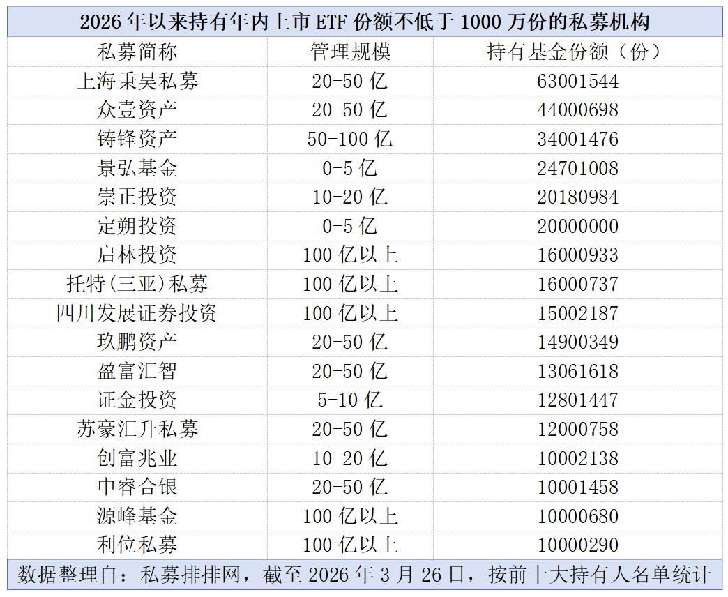 3月27日,私募排排网最新数据显示,截至2026年3月26日,年内已有58家私募机构现身45只新上市ETF的前十大持有人名单,合计持有份额约4.95亿份,显示私募机构借道ETF布局市场的热情持续升温。