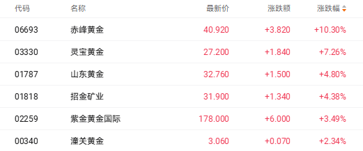 截至收盘,赤峰黄金(06693.HK)涨10.30%、灵宝黄金(03330.HK)涨7.26%、山东黄金(01787.HK)涨4.80%。