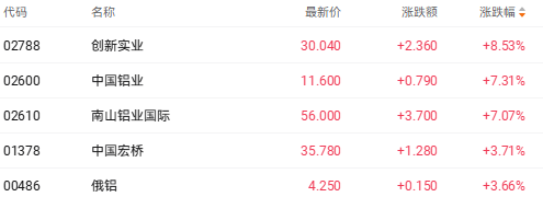 地缘冲突推升供给风险中国铝业涨超7%截至收盘,创新实业(02788.HK)涨8.53%、中国铝业(02600.HK)涨7.31%、俄铝(00486.HK)涨3.66%。