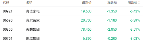 家电股走低海信家电跌超6%截至收盘,海信家电(00921.HK)跌6.43%、海尔智家(06690.HK)跌5.3%、美的集团(00300.HK)跌3.51%。