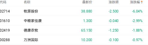 猪肉股受业绩承压牧原股份跌超6%截至收盘,牧原股份(02714.HK)跌6.04%、中粮家佳康(01610.HK)跌2.99%、德康农牧(02419.HK)跌1.88%。