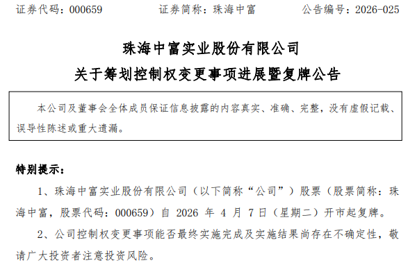 除亿利达外,珠海中富(000659)此前公告,公司正在筹划向特定对象发行A股股票,该事项可能会导致公司控制权发生变更,公司股票自4月2日开市起停牌。