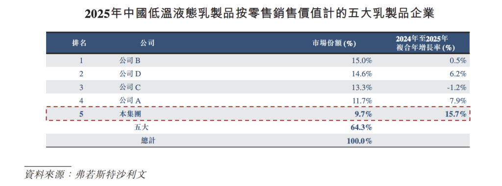招股书显示,按2025年低温液态乳制品的零售销售价值计,新乳业在中国低温液态乳制品市场中排名第五,且于2024年至2025年,在中国前五大乳制品企业中,低温液态乳制品的零售销售价值增速最快。于2025年,以低温液态乳制品零售销售价值计算,中国低温液态乳制品市场中五大乳制品企业的合并市场份额为64.3%,其中新乳业的市场份额为9.7%,与头部企业仍有一定差距。