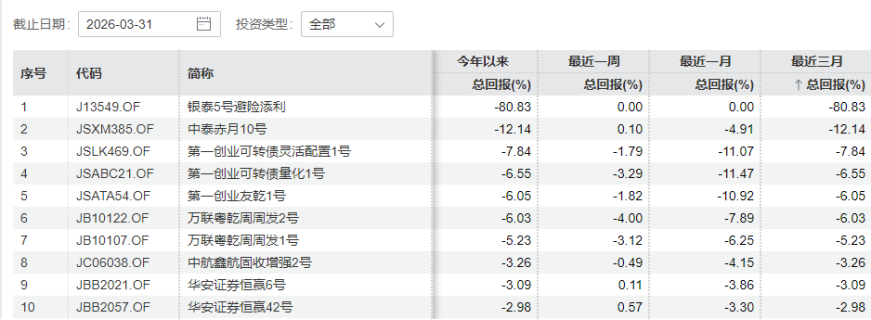 其中,第一创业可转债灵活配置1号(JSLK469.OF)、第一创业可转债量化1号(JSABC21.OF)、第一创业友乾1号(JSATA54.OF)、万联粤乾周周发2号(JB10122.OF)、万联粤乾周周发1号(JB10107.OF)五款产品无论是3月还是一季度的区间回报均低于-5%。