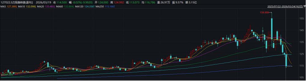 同样在赎回机制触发时大幅下跌的还有“恒逸转债”,该可转债由恒逸石化股份有限公司发行,上市日期为2020年11月16日,摘牌日期为2026年4月2日,发行规模为20亿元。公司于3月2日召开董事会会议审议通过了《关于提前赎回“恒逸转债”的议案》,3月19日为“恒逸转债”的最后一个交易日。3月,“恒逸转债”累计下跌17.76%,最后一个交易日下跌幅度高达8.02%。