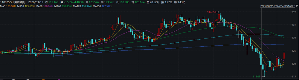 此外,出现大幅度回撤的还有“南航转债”,月累计下跌超11%。“南航转债”由中国南方航空股份有限公司发行,上市日期为2020年11月3日,到期日为2026年10月15日,发行规模为160亿元。“南航转债”在3月19日大幅跳水3.56%至119.469元,创下3月单日最大跌幅。