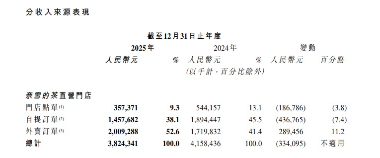 奈雪的茶同样损失惨重。2025年实现收入43.31亿元,同比下降12%,经调整净亏损2.41亿元,在六家上市茶饮企业中成为唯一仍在亏损的品牌。外卖收入占比首次突破50%,但门店点单和自提订单收入双双下降,客单价持续下滑,已降至24.4元。