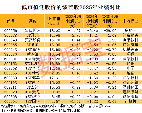 从已披露的业绩数据来看,按照年报、业绩快报、预告净利润下限(无下限则取公告数值)计算,上述16只低价低市值且业绩连亏的股票中,2025年净利润亏损的股票有14只。皇庭国际、ST开元、莫高股份净利润亏损金额超1亿元。