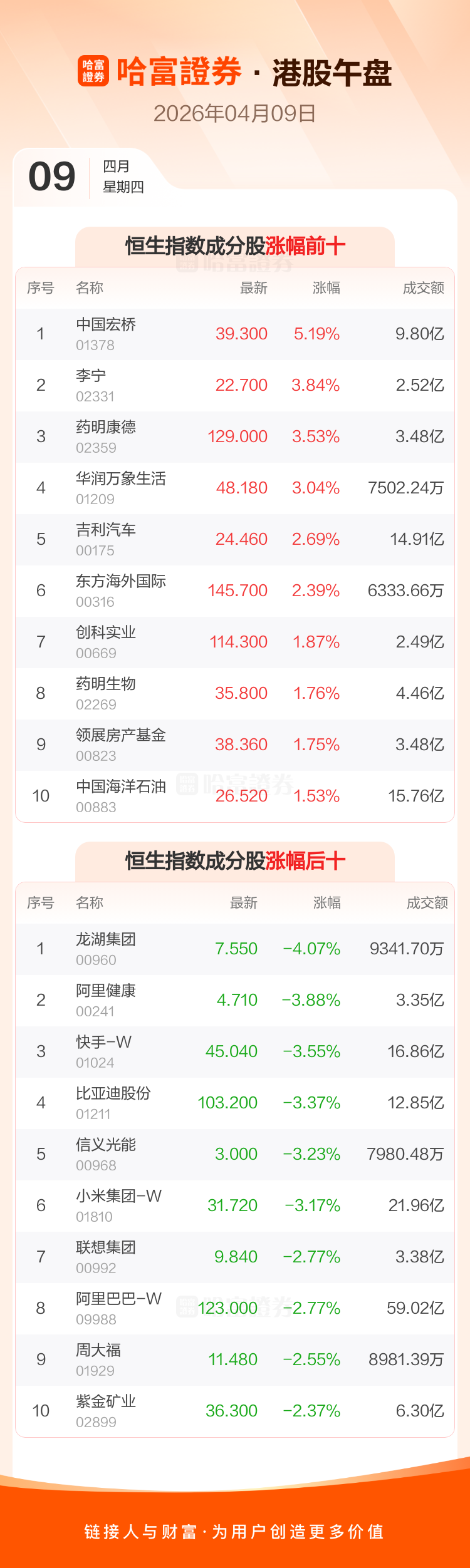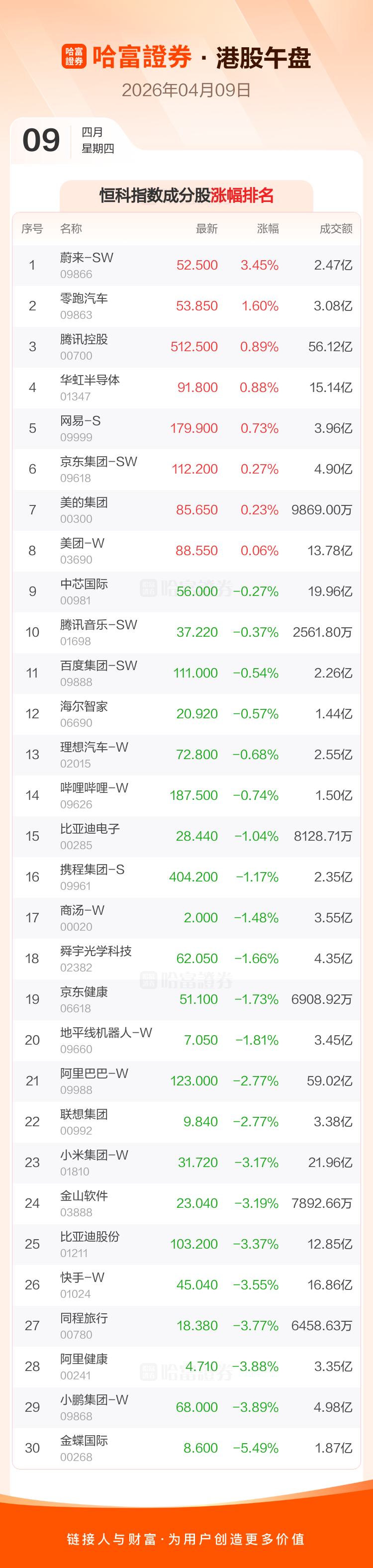 港股4月9日午盘走低,恒生指数收报25801.87点,跌91.15点,跌幅0.35%;恒生科技指数收报4861.15点,跌62.1点,跌幅1.26%。恒生指数成分股中中国宏桥、李宁、药明康德涨幅居前,龙湖集团、阿里健康、快手-W跌幅靠前。恒生科技指数成分股中蔚来-SW、零跑汽车、腾讯控股涨幅居前,金蝶国际、小鹏集团-W、阿里健康跌幅靠前。