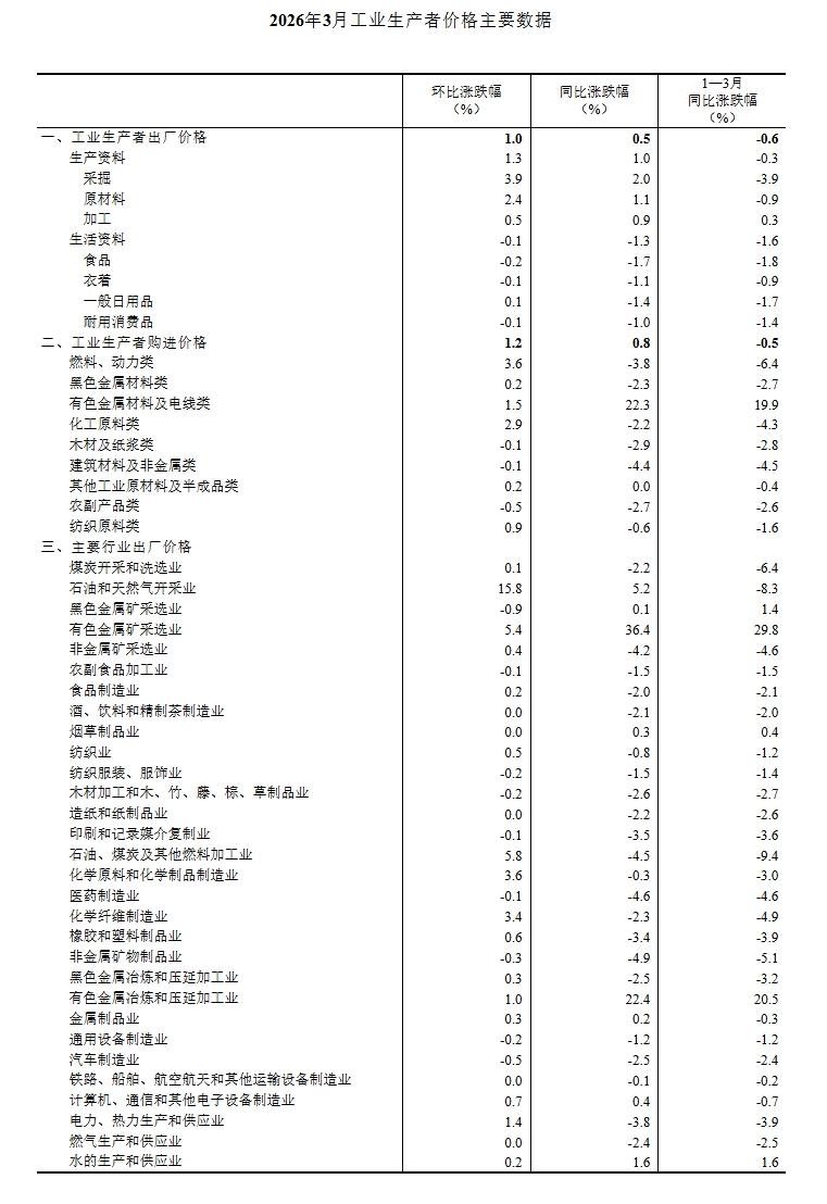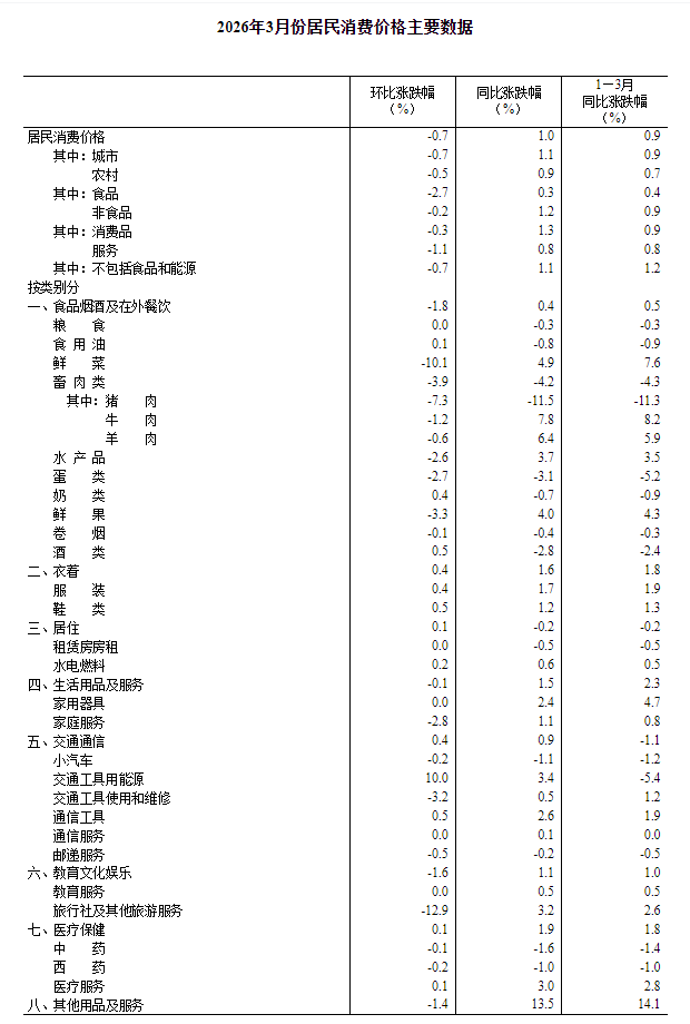 2026年3月份,全国居民消费价格同比上涨1.0%,环比下降0.7%。其中,城市上涨1.1%,农村上涨0.9%;食品价格上涨0.3%,非食品价格上涨1.2%;消费品价格上涨1.3%,服务价格上涨0.8%。工业生产者出厂价格同比由上月下降0.9%转为上涨0.5%。