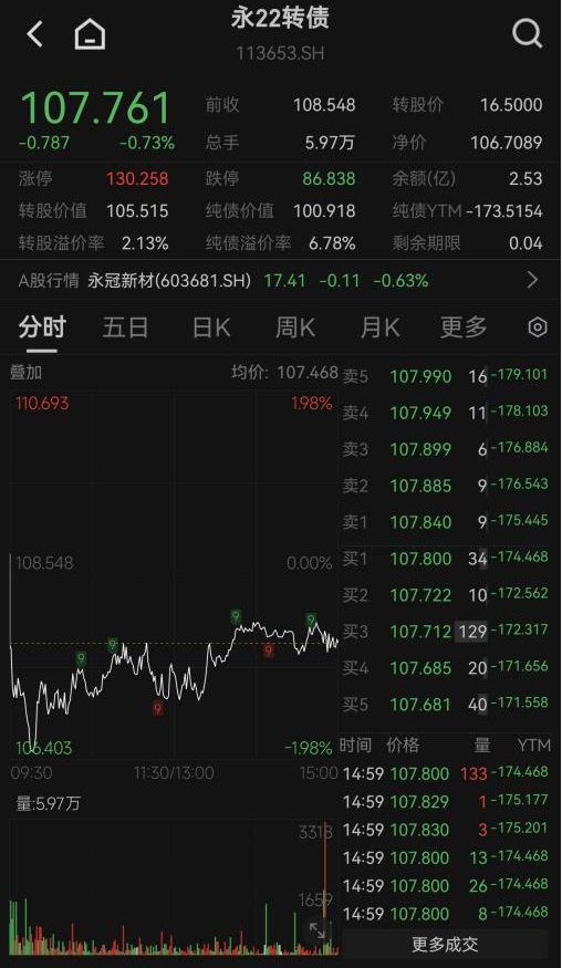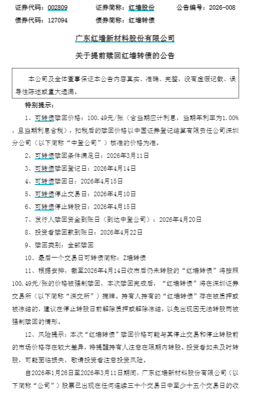 【导读】远信转债强赎倒计时!未及时操作,或将面临57%的亏损。远信转债进入强赎倒计时,明日将是远信转债最后一个交易日。截至4月9日收盘,远信转债二级市场价格为235元,而强赎价格仅为100.47元。投资者若不及时卖出持有的可转债,也未在规定时限内完成转股,将面临57.08%的被动亏损。远信转债最后交易日为4月10日。根据公告安排,远信转债将于4月13日(下周一)正式停止交易。受周末休市影响,4月10日(明日)将是该转债最后的交易时间。根据公告,远信转债赎回登记日为4月15日;当日收盘后,既未出售也未转股的债券将按照100.47元/张的价格被强制赎回。3月16日,远信转债发布公告称,其正股远信工业股份有限公司,在2月24日至3月16日期间,已有15个交易日收盘价不低于当期转股价格(22.95元/股)的130%,即29.835元/股,已触发可转债有条件赎回条款。截至4月9日收盘,远信工业股份有限公司股价为53.78元/股。更多可转债将迎强赎。据集思录数据,永22转债、亿纬转债将在4月中下旬停止交易并强制赎回,赎回价格均为100元出头。截至4月9日收盘,永22转债、亿纬转债的价格分别为107.761元和129.088元。红墙转债自4月10日停止交易。截至4月9日收盘,红墙转债二级市场价格为104.132元/张。