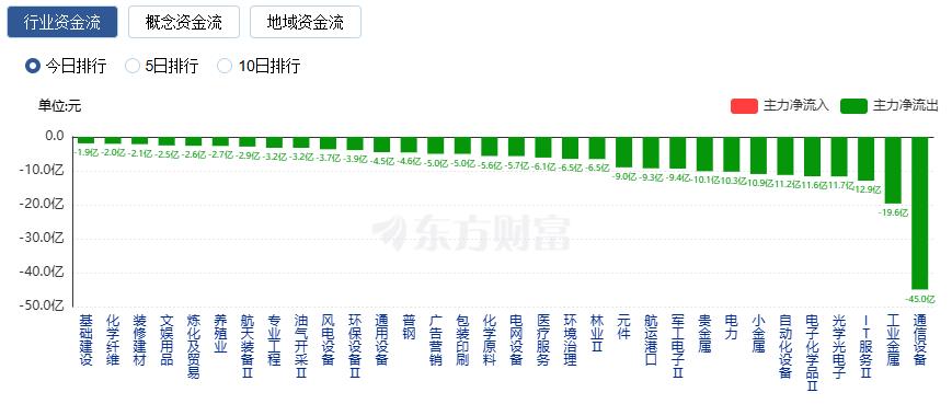 净流出方面,通信设备、工业金属、IT服务等净流出排名靠前,其中通信设备净流出44.98亿元。