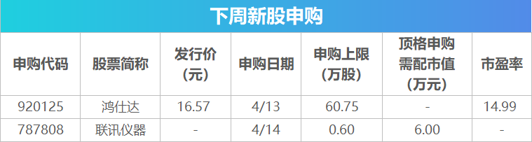 Wind数据显示,下周将有2只新股发行,具体来看,4月13日发行的是北交所鸿仕达;4月14日发行的是科创板联讯仪器。此外,下周还有1只新股上市,创达新材将于4月13日在北交所上市。