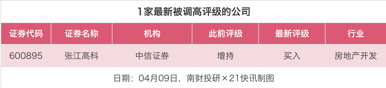 评级调高方面,4月9日,券商调高上市公司评级1家次,中信证券张江高科的评级从“增持”调高至“买入”。