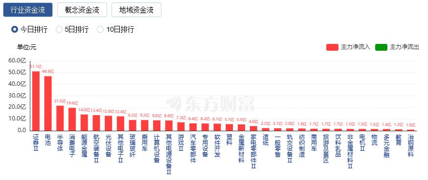 行业资金方面,截至收盘,证券、电池、半导体等净流入排名靠前,其中证券净流入51.05亿。