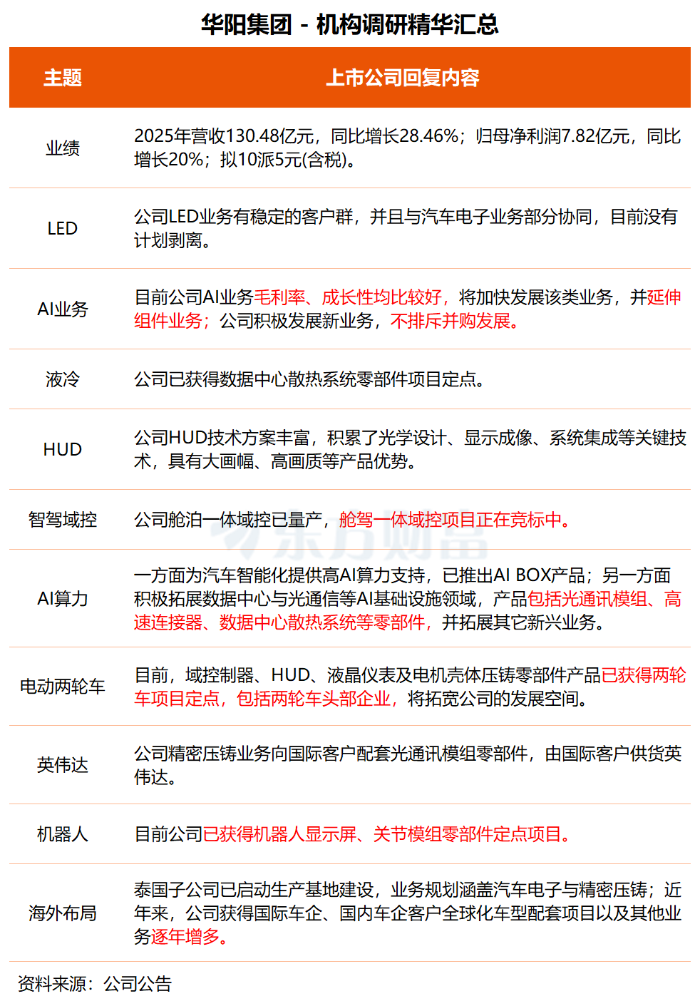 对于电动两轮车业务布局,华阳集团表示,公司依托自身在汽车电子及精密压铸领域多年积累的深厚技术能力与成熟量产经验,顺应两轮车智能化、高端化升级趋势,目前域控制器、HUD、液晶仪表及电机壳体压铸零部件产品已获得两轮车项目定点,包括两轮车头部企业,将拓宽公司的发展空间。