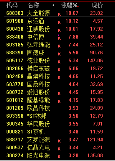 受此影响,午后光伏概念股震荡反弹,硅料方向领涨,通威股份、京运通涨停,大全能源涨超10%,合盛硅业、爱旭股份、亿晶光电跟涨。